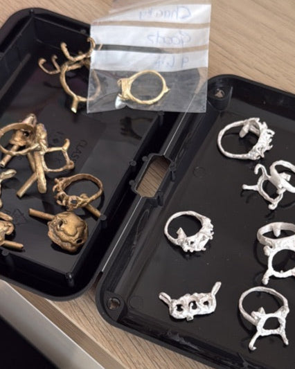 All pieces are measured in grams when I send them to the caster. This means that larger, heavier pieces will be more expensive than smaller, lighter ones. Most of my work ranges from 3 to 8 grams of solid gold, silver, or brass — with most rings weighing around 4–5 grams. The pricing below is based on these averages. In some cases, your piece might even cost less if it’s smaller or more delicate (since it uses less material).