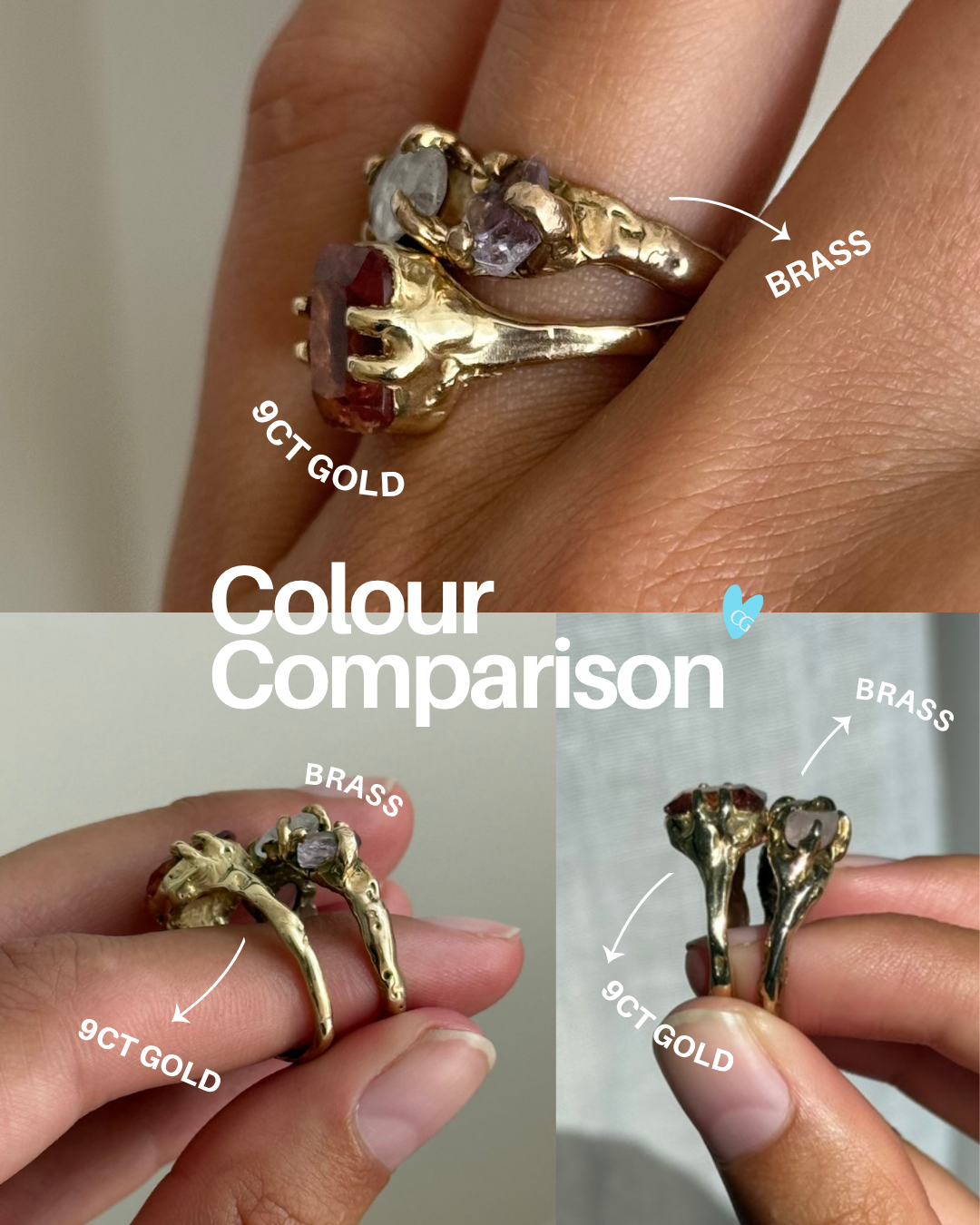 In the photo on the right, you can see the difference in color between 9ct gold and brass. Brass is a beautiful, more affordable alternative to solid gold, though it may develop surface stains a little faster. The good news? Every piece comes with a polishing cloth, so you can easily restore its shine whenever needed.