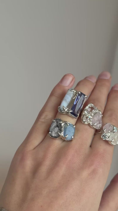 This ring is crafted from recycled 925 silver and showcases 2 stones. A Swarovski stone and a blue lace Agate. An amazing eye-catcher!