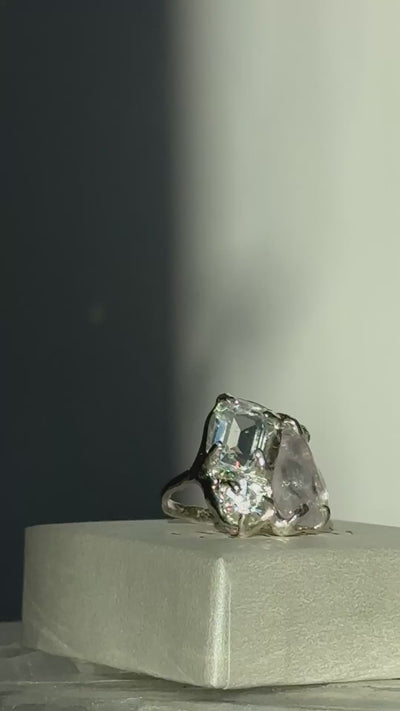 This ring is crafted from recycled 925 silver and showcases 3 stones. 1 raw Clear quartz and Swarovski stones. The perfect winter ring!